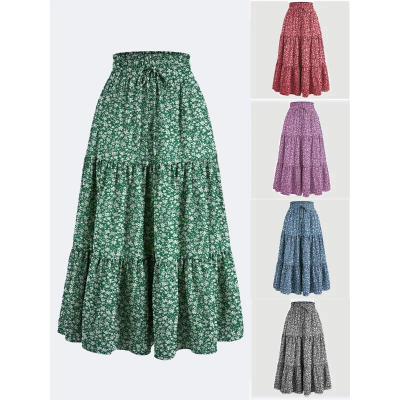 New Fashion Women Boho Floral Maxi Skirt Elastic High Waist A Line Flowy Long Skirt Vintage Beach Vacation Casual Dressy Bottoms $19.46