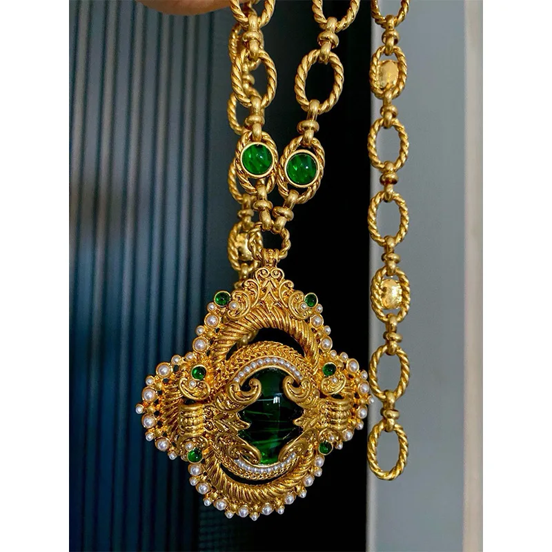Vintage Red Green Gemstone Brass 18K Gold Plated Sweater Chain Long Necklace Woman Glamorous Jewelry Trend $73.55