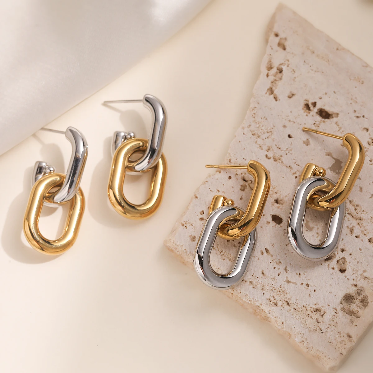 Stylish Two Tone Stainless Steel Interlocking U Chain Link Drop Earrings Waterproof Dangle Stackable Women Fashion Jewelry $3.02