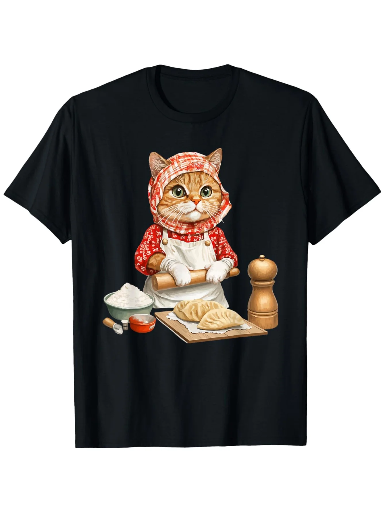Chef Cat Baking Dumplings Graphic Tee Funny Kitten Rolling Pin Cotton Short Sleeve T-Shirt for Food Lovers $13.41