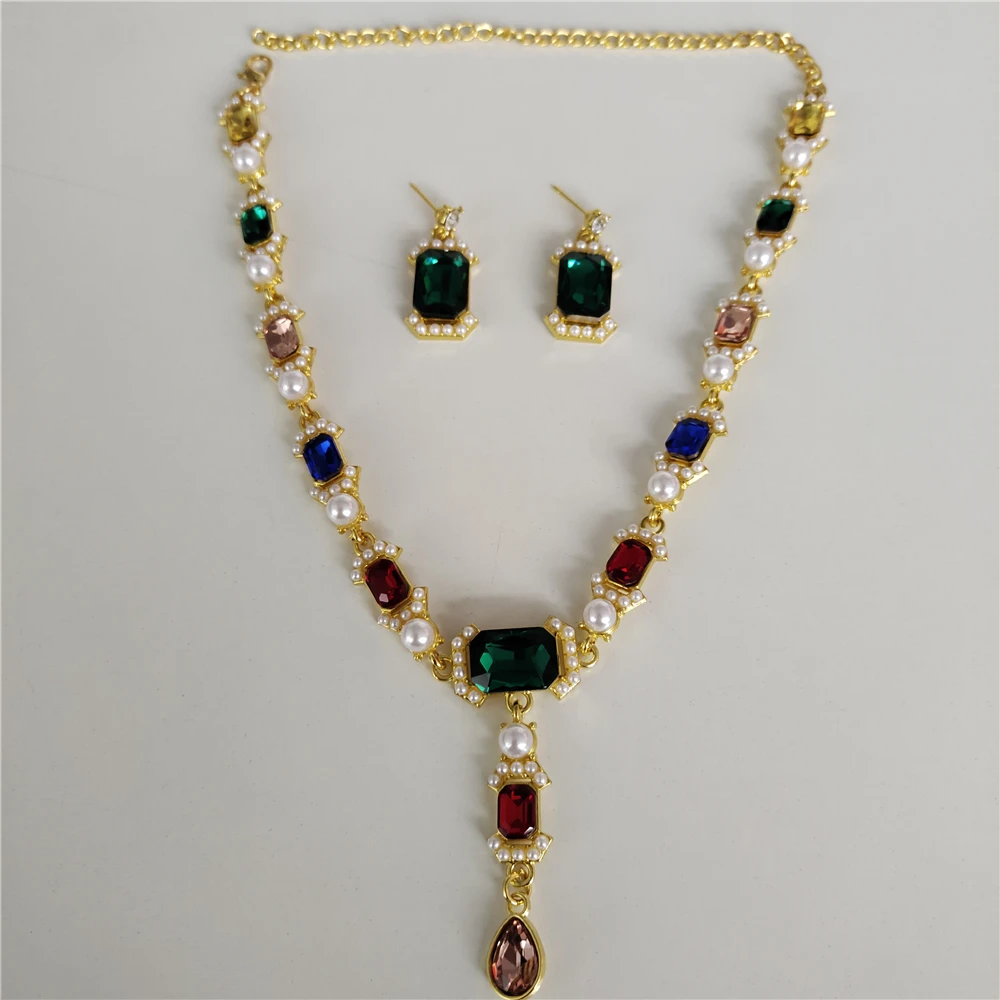 2025 New Colorful Glass Imitation Pearl Necklace Earrings Women Jewelry Sets Indian Statement Baroque Pendants Necklaces Jewelry $6.84