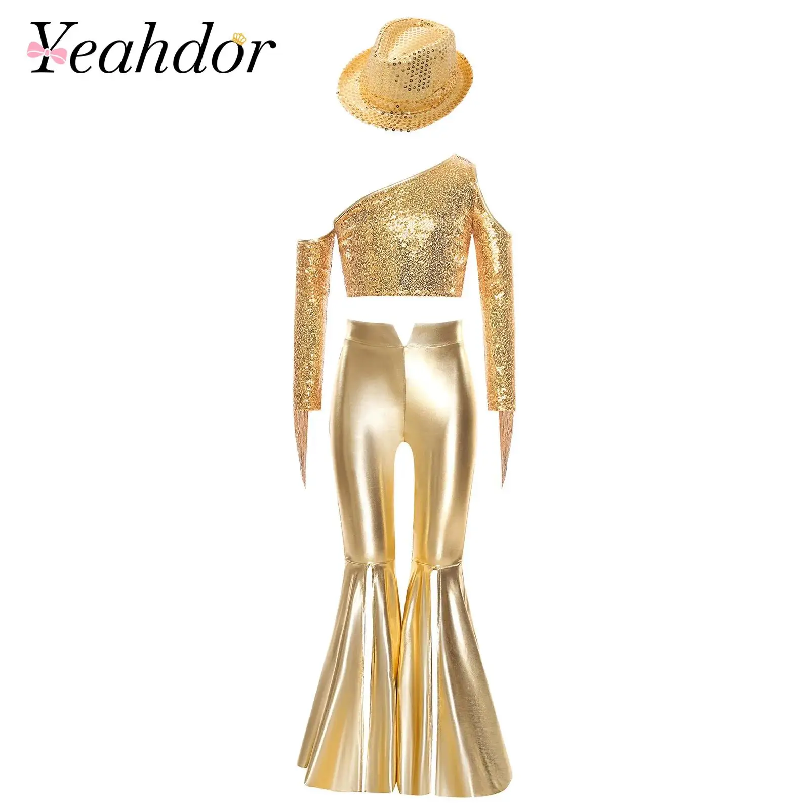 Children Jazz Hippie Costume Metallic 70S Disco Outfits for Girl Fashion Kids Sequins Dancewear Crop Top + Bell Bottom Pants $23.61
