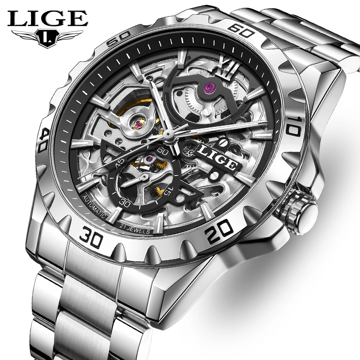 LIGE Skeleton Mens Watches Ring Luxury Man Automatic Mechanical Watches Luminous Waterproof Stainless Steel Strap Watch+Box $34.65