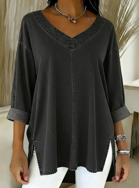 Women's T-Shirt Spring New Fashion Trendy Solid Color Simple V-Neck Loose Cowboy Fabric Versatile Long Sleeve T-Shirt Top $7.64