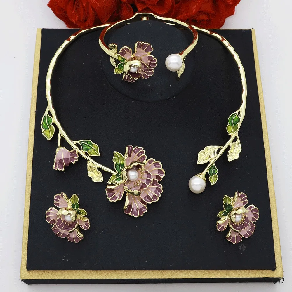 New Charming Flower Shape Women Jewelry Set Luxury Design Purple Flower And White Pearl Pendant Necklace Earring And Bracelet $33.75