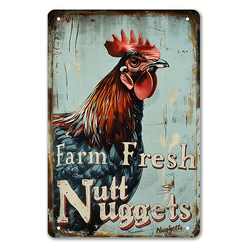 2D planar retro tinplate metal logo | Farm fresh gold nugget rooster design, durable iron wall decoration 8x12 inches $5.42