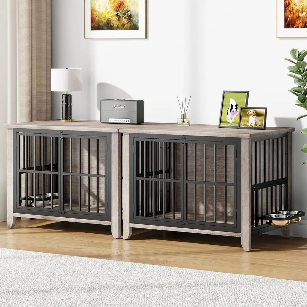Wooden Dog Crate Furniture Set for Medium & Small Dogs with 360° Swivel Feeder and Adjustable Bowls, Grey $455.73