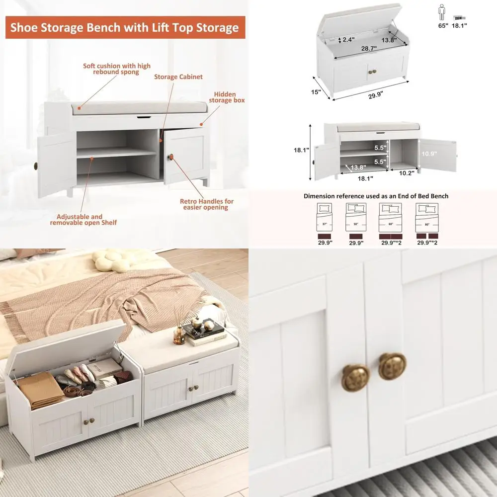 30 White Shoe Storage Bench with Cushion, Lift-Top Entryway Furniture, Wooden Bedroom or Hallway Organizer $97.41