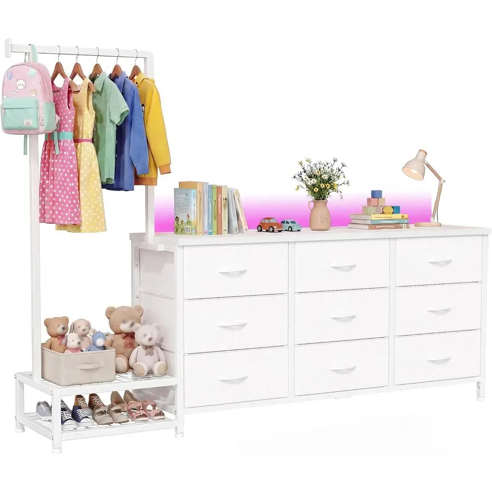 White Wooden Bedroom Furniture Set with LED Lights, Hanging Rack, Fabric Drawers, and Extendable Garment Rod $144.09