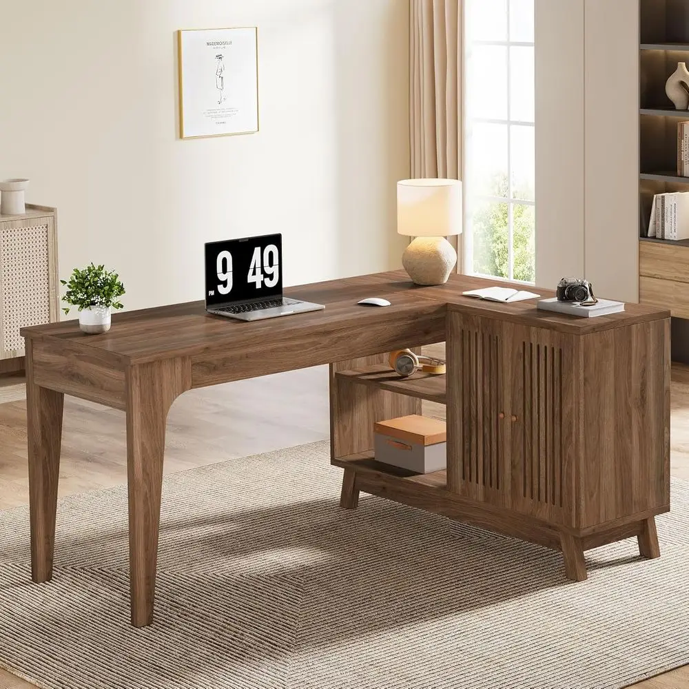 57 Walnut L-Shaped Desk with Storage Cabinet, Home Office Computer Workstation, Study Writing Table for Bedroom $183.08