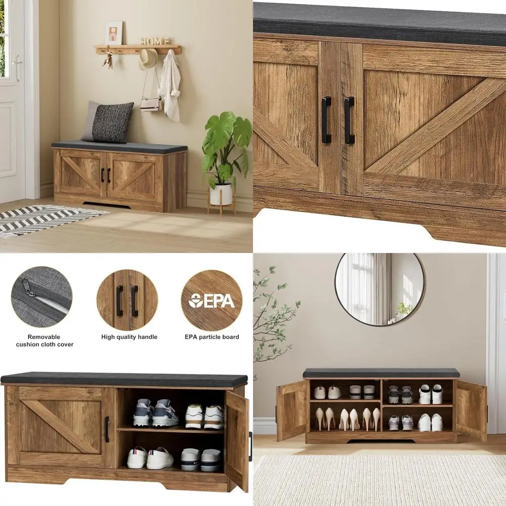 2-Tier Shoe Storage Bench, 39.4 Wide with Cushion, Barn Door Entryway Furniture, Adjustable Shelf, Rustic Walnut $159.83