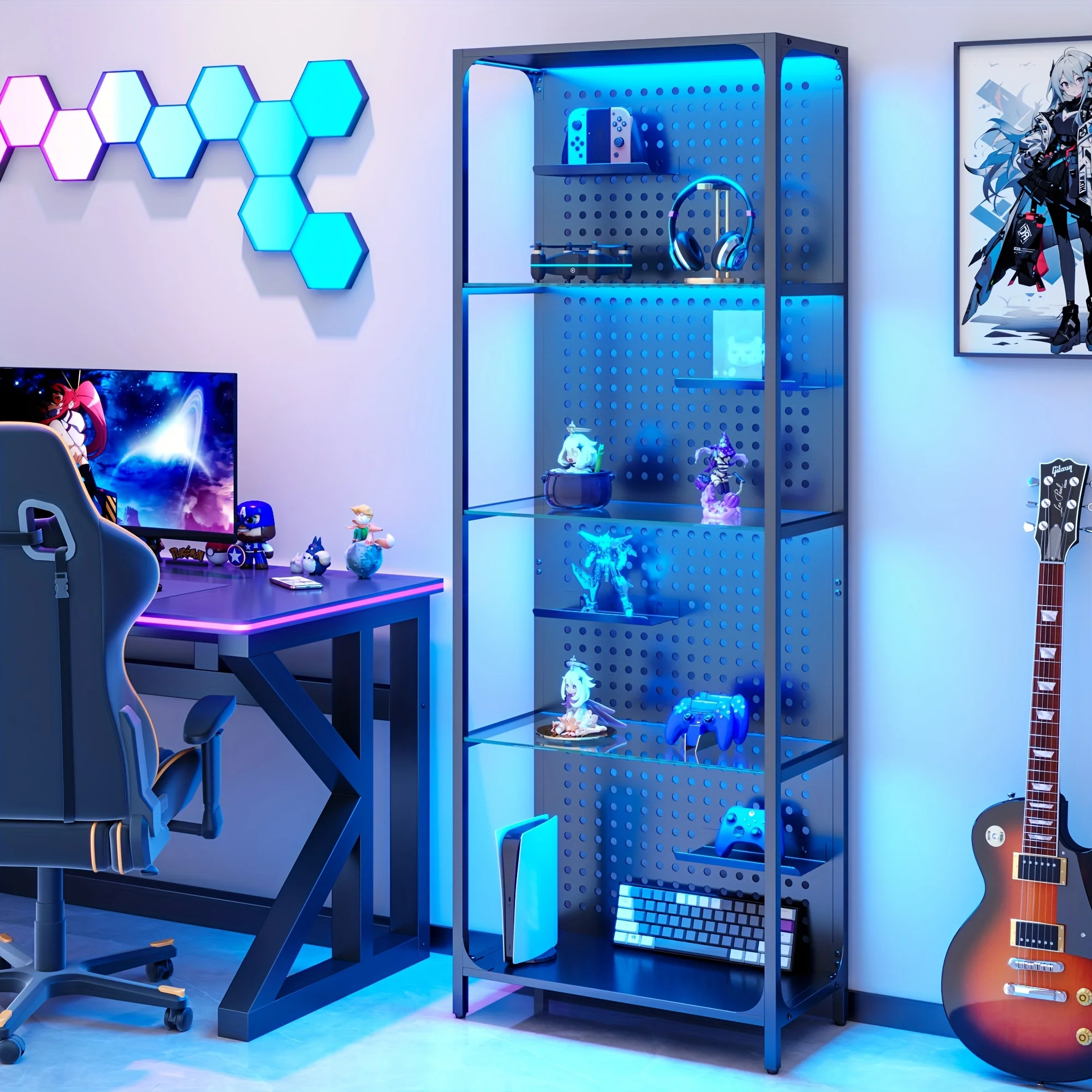 Glass Display Shelf for Collectibles, 4-Tier Curio Cabinet & Bookcase with 3 Color LED Light Black Shelf, Adjustable Shelf, Ligh $213.73