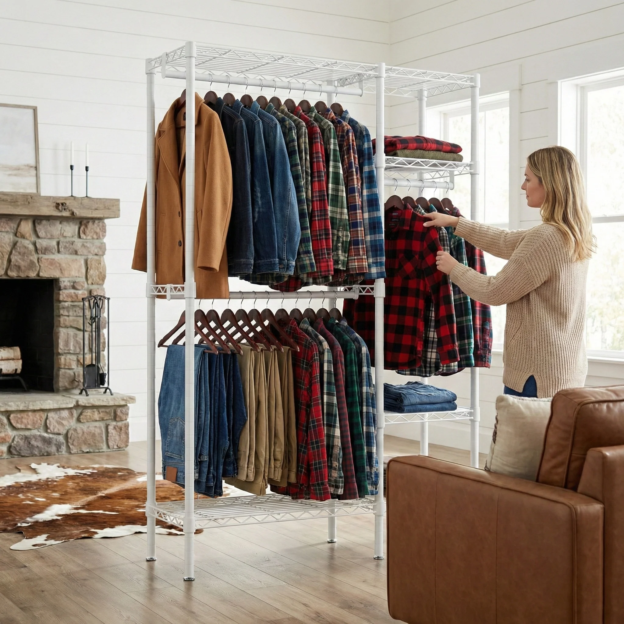 Heavy Duty 2-Column 4-Tier White Wardrobe Organizer, 700lb Capacity, 6 Shelves & 2 Rods, Space-Saving Storage for Dresses & Clot $124.09