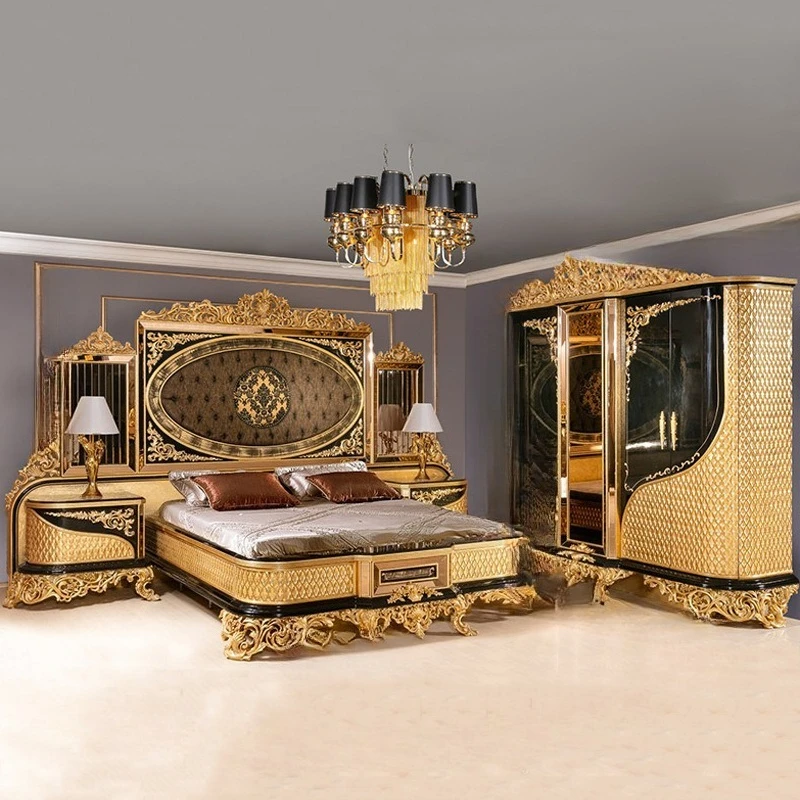 French fabric solid wood carving European fabric double bed French four-door wardrobe gold foil dresser villa $3,757.14