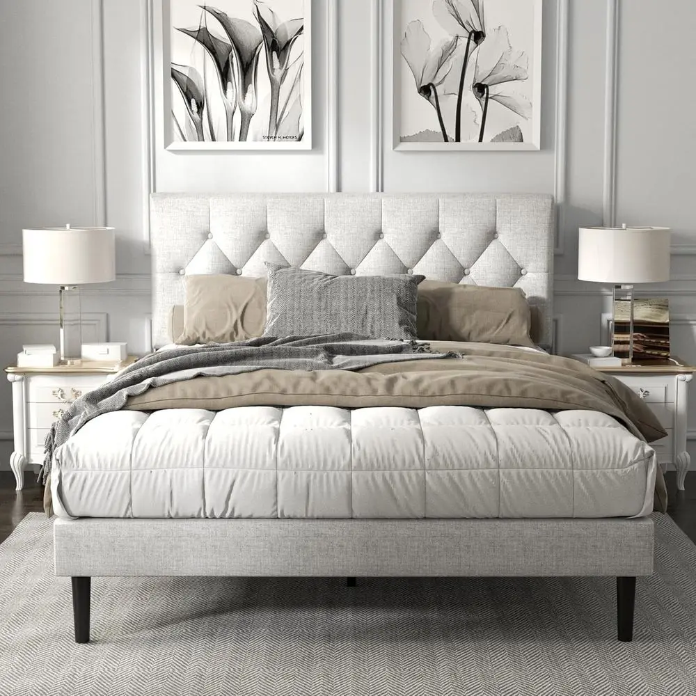 Light Grey Upholstered Queen Platform Bed with Button Tufted Headboard, Wooden Slat Support, No Box Spring, Easy Assembly $184.12