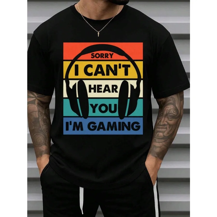 【New style】Men'S 180GSM Gamer T-Shirt With Headphone And Gaming Print Casual Round Neck Short Sleeve Tee Perfect For Casual Att $6.81