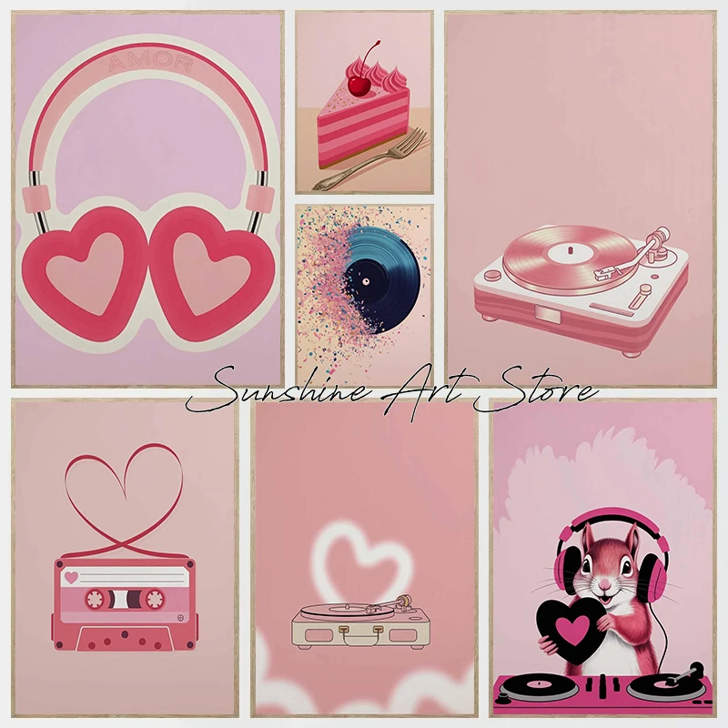 Pink Girly Music Heart Headphones Cassette Tape Record Player DJ Squirrel Retro Music Poster Canvas Painting Wall Pictures Decor $4.43