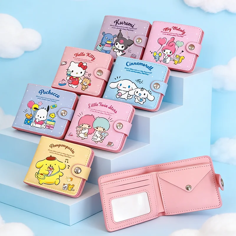 Hello Kitty PU Leather Wallet Button Folding Purse Kawaii Kuromi Melody Cinnamoroll Coin Card Holder Casual Money Bag Girl Gifts $6.28