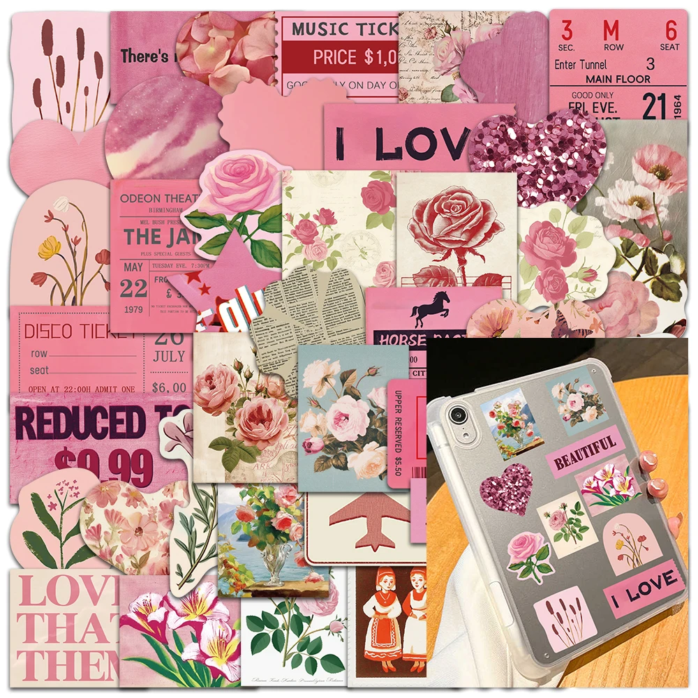 50pcs Retro Pink Aesthetic Heart Flowers Stickers For Stationery Luggage Laptop Guitar Waterproof Vinyl Phone Decals $3.32