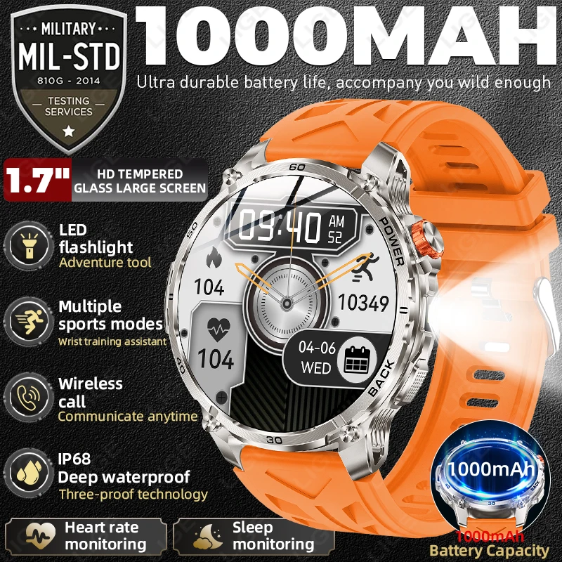 1000mAh Battery Smart Watch 2026 New IP68 Waterproof LED Flashlight Bluetooth Call Military Grade Outdoor Sports Smartwatch Men $38.56