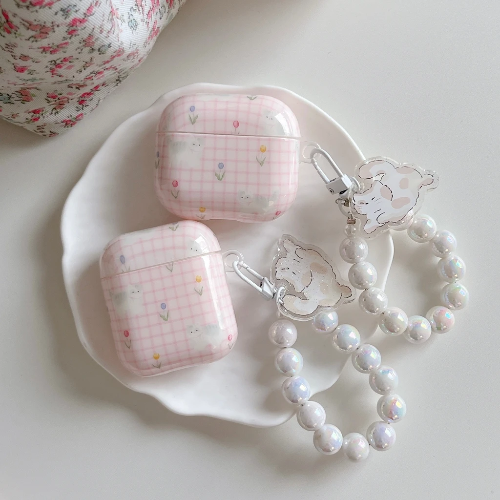 Sweet Cute Pink Plaid Cat Flower With Beads Pendant Shockproof Protective Earphone Cover Case for Airpods 1 or 2 3 4 Pro 2 Pro 3 $9.24