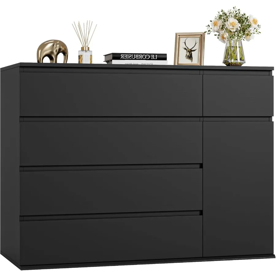5-Drawer Dresser with Black Finish Designed for TV Stand Use Features Double-Wide Storage Chest of Drawers with Built-In Door D $172.13