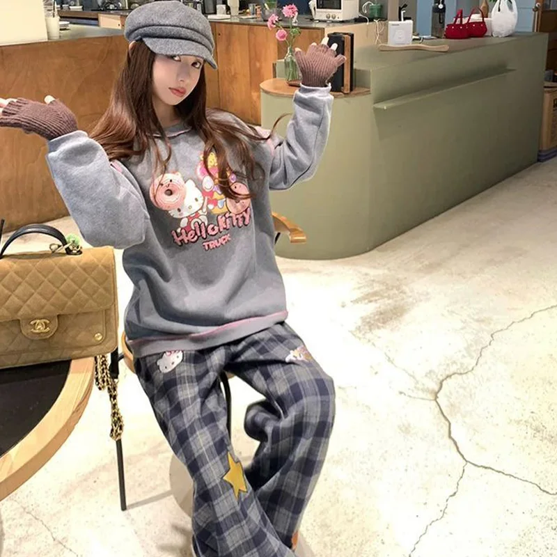 Sanrio Hello Kitty Fleece Lined Plaid Pants Girl Fall Winter Sweet Edgy Style Loose Straight Leg Slimming Versatile Casual Set $5.58