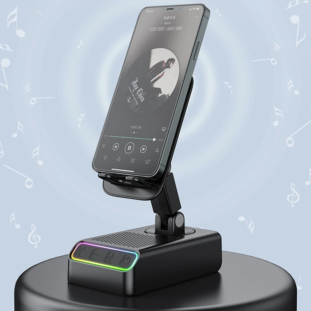 Cell Phone Stand Wireless Induction Bluetooth Speaker 360° Surround Sound RGB Color Light Sound System Tablet Stand $19.17