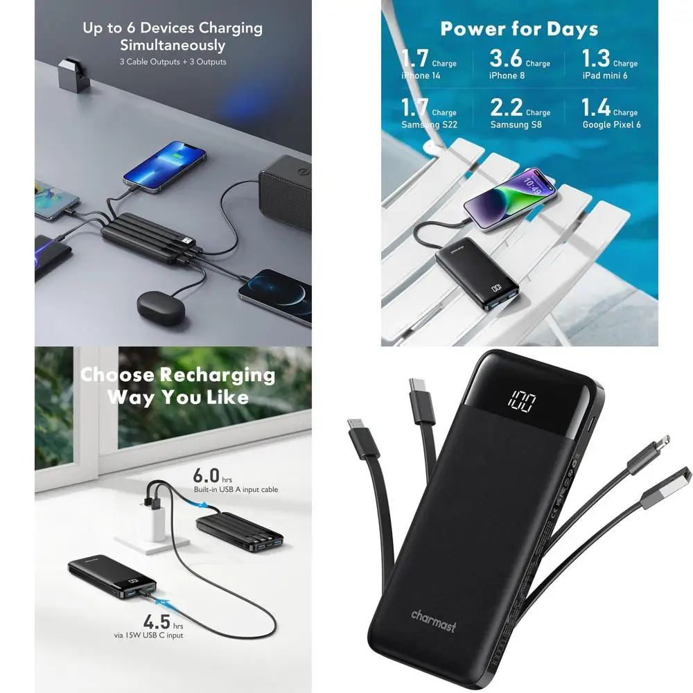 Slim 10000mAh Portable Charger with Built-in Cables, 6 Outputs, 3 Inputs, Fast Charging for Smartphones and Tablets $24.47