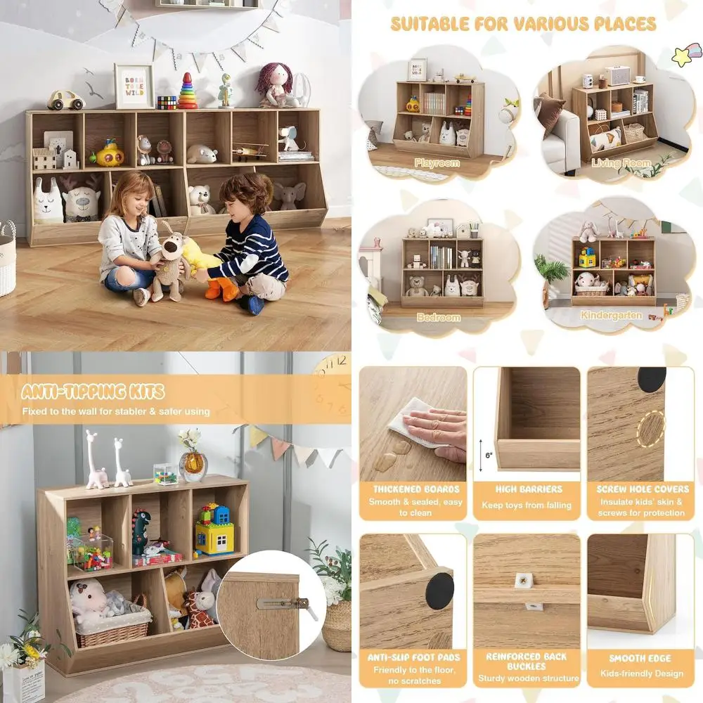 Natural Wood Kids Toy Storage Cabinet with Anti-Toppling, Playroom Organizer, Bookshelf for Nursery & School $150.09