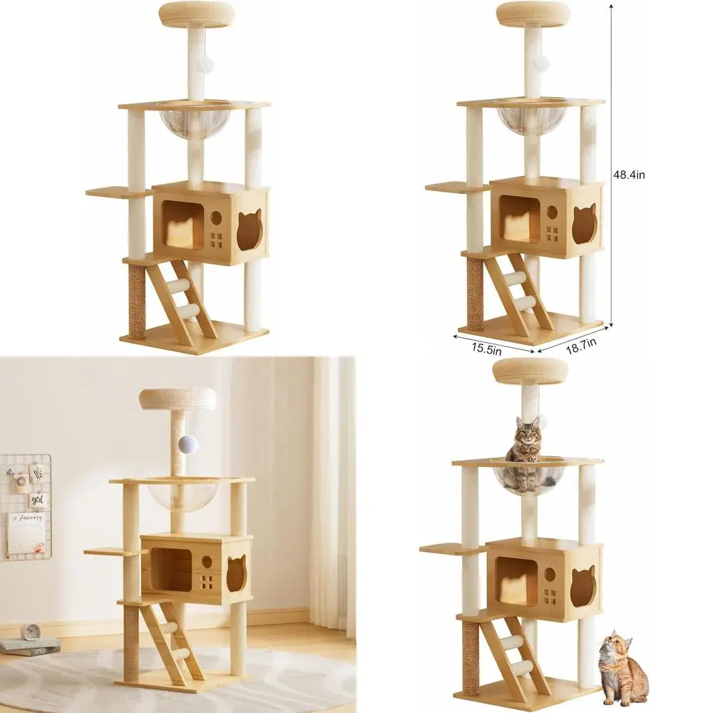 Beige Tall Wood Cat Tower with Scratching Post, Hammock, Perch, and Toy Ball for Large Indoor Cats $101.35