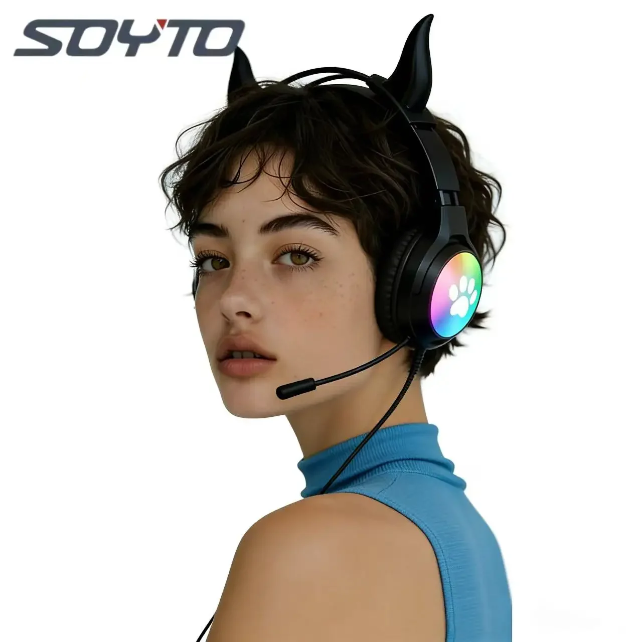 SOYTO Stylish Detachable Magic Ear RGB LED Wired Over-Ear Gaming Headset Noise Cancelling Deep Bass Headphones for PC 4 Colors $22.98
