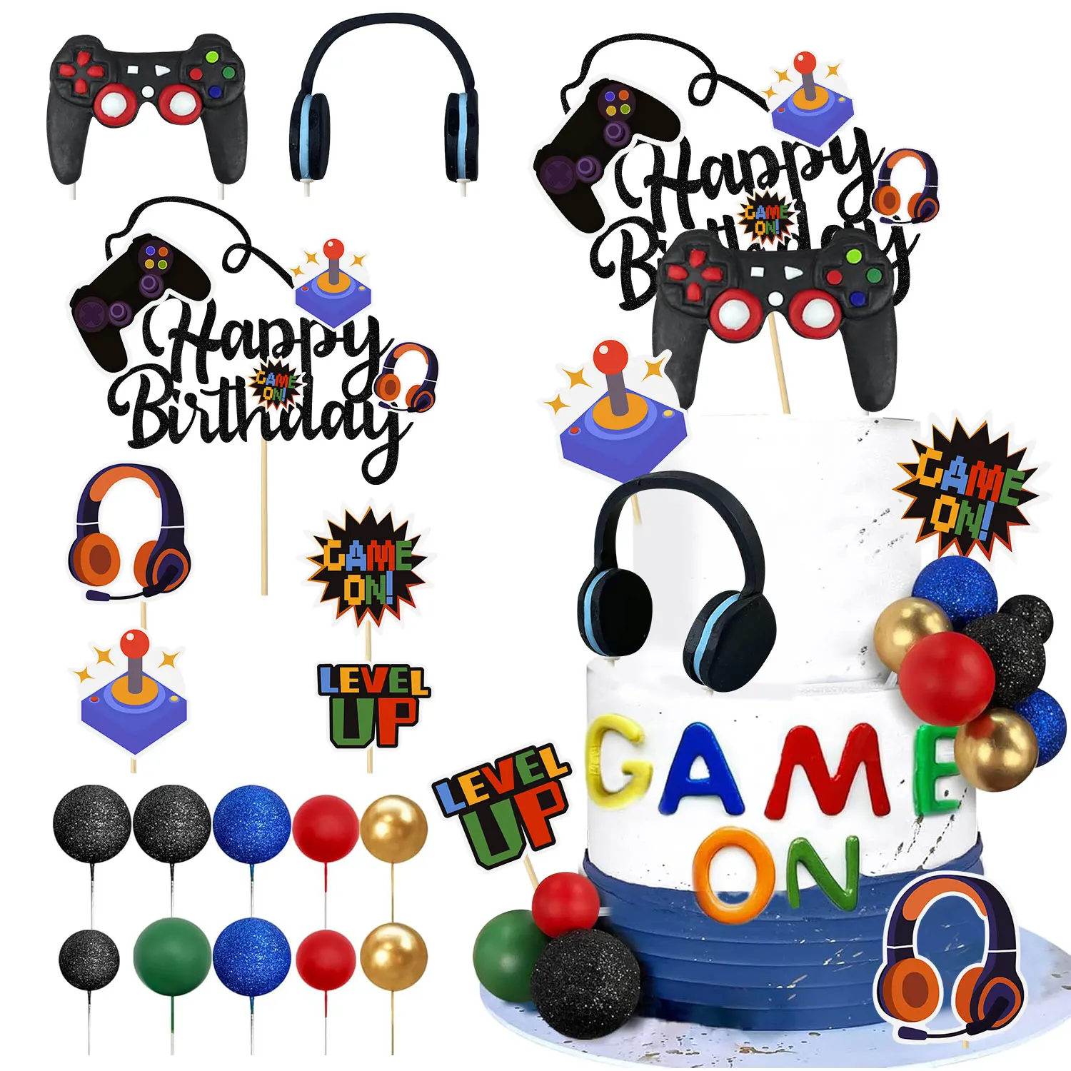17Pcs Video Retro Game Cake Toppers with Controller & Headset for Gaming Theme Happy Birthday Party Decor - Ball Decorations $8.26